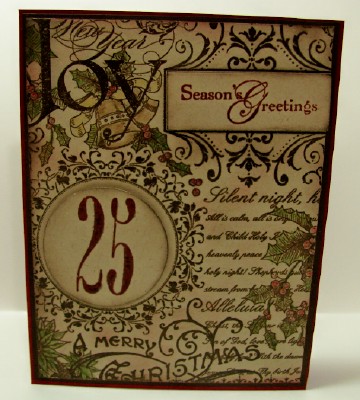 We just love the Christmas Collage stamp! Nanci inked it in VersaMark and Early Espresso and heat embossed the image with clear embossing powder on Crumb Cake card stock. She used the same procedure for the sentiment and the "25, " but she used Cherry Cobbler for the ink. She punched them out and used dimensionals to add depth to the card. She used colored pencils to fill in some of the images of the stamp. This picture doesn't do the card justice--it is really a show stopper when you see it in person.
